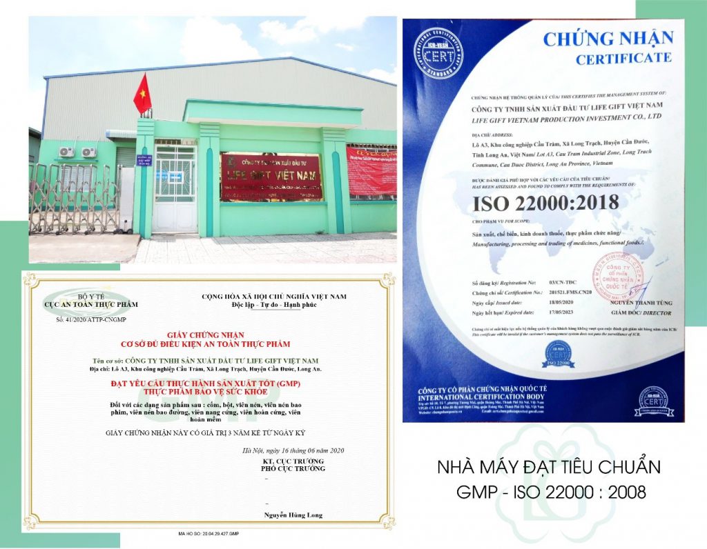 Công ty TNHH Sản xuất – Đầu tư Life Gift Việt Nam tự hào là một trong những đơn vị sản xuất thực phẩm bảo vệ sức khỏe tại Việt Nam được Cục An Toàn Thực Phẩm – Bộ Y Tế cấp giấy chứng nhận GMP – Hệ thống quản lý chất lượng ISO 22000:2018.Máy móc, thiết bị hiện đại: Nhà máy Life Gift VN được trang bị những máy móc hiện đại, đạt tiêu chuẩn GMP. Đã được qua kiểm duyệt kỹ càng, đầy đủ khả năng sản xuất và đem lại sản phẩm chất lượng cao.