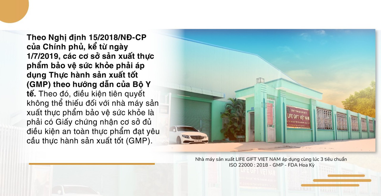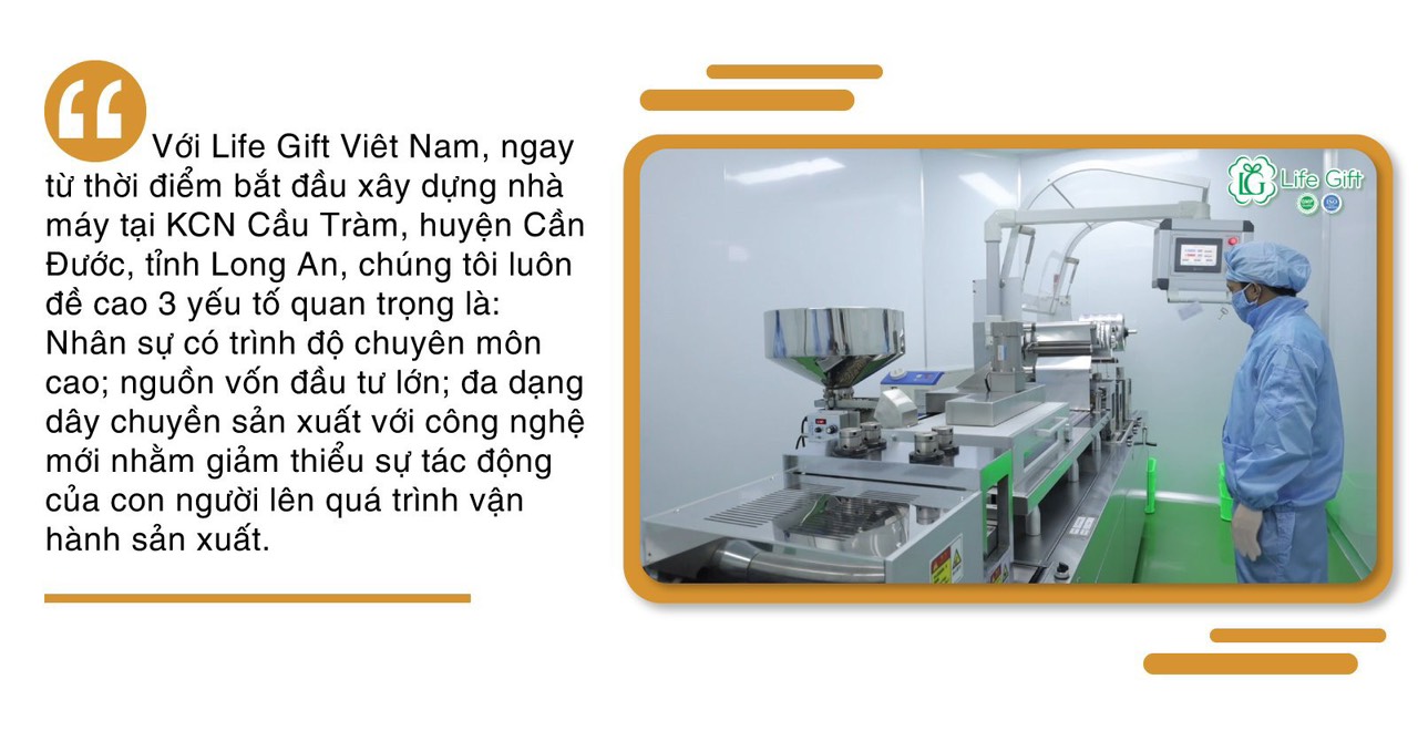 Với Life Gift Viêt Nam, ngay từ thời điểm bắt đầu xây dựng nhà máy tại KCN Cầu Tràm, huyện Cần Đước, tỉnh Long An, chúng tôi luôn đề cao 3 yếu tố quan trọng là: Nhân sự có trình độ chuyên môn cao; nguồn vốn đầu tư lớn; đa dạng dây chuyền sản xuất với công nghệ mới nhằm giảm thiểu sự tác động của con người lên quá trình vận hành sản xuất. Đặc biệt, để bảo đảm nhà máy đạt tiêu chuẩn GMP, chúng tôi đã ký kết hợp tác với một đơn vị có thâm niên trong ngành tại Malaysia tư vấn, chuyển giao công nghệ, theo dõi tiến độ, kiểm tra, đánh giá năng lực nhà thầu xây dựng, đơn vị cung ứng trang thiết bị, xây dựng các quy trình quản lý chất lượng, đào tạo nâng cao chuyên môn cho đội ngũ nhân sự. Nhờ có sự chuẩn bị kỹ lưỡng từ đầu, Life Gift Việt Nam đã được Cục An toàn thực phẩm (Bộ Y tế), cấp giấy chứng nhận GMP. Ngoài tiêu chuẩn bắt buộc trên, chúng tôi cũng áp dụng đồng thời cả hai tiêu chuẩn ISO22.000-2018; FDA. Ngoài những công thức sản phẩm được chuyển giao từ nước ngoài, bộ phận nghiên cứu và triển khai của chúng tôi cũng tự nghiên cứu phát triển nhiều sản phẩm. Đồng thời, chúng tôi đã ký kết hợp tác với Khoa Dược – Trường Đại học Nguyễn Tất Thành để tiếp nhận chuyển giao nhiều quy trình, công nghệ và các đề tài nghiên cứu khoa học phục vụ việc sản xuất ra những sản phẩm thực phẩm bảo vệ sức khoẻ chất lượng.
